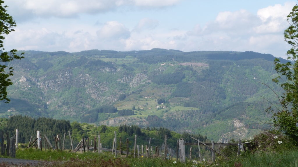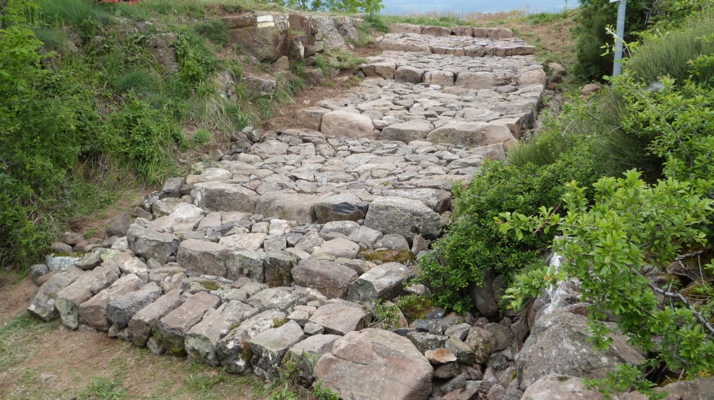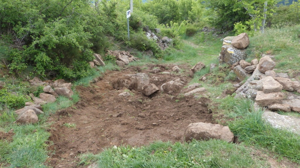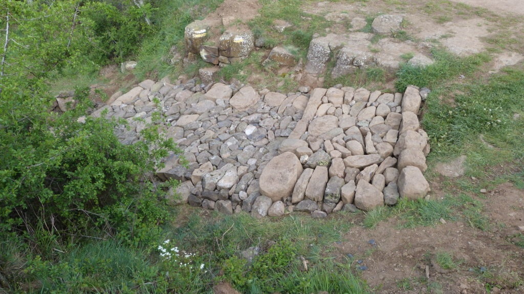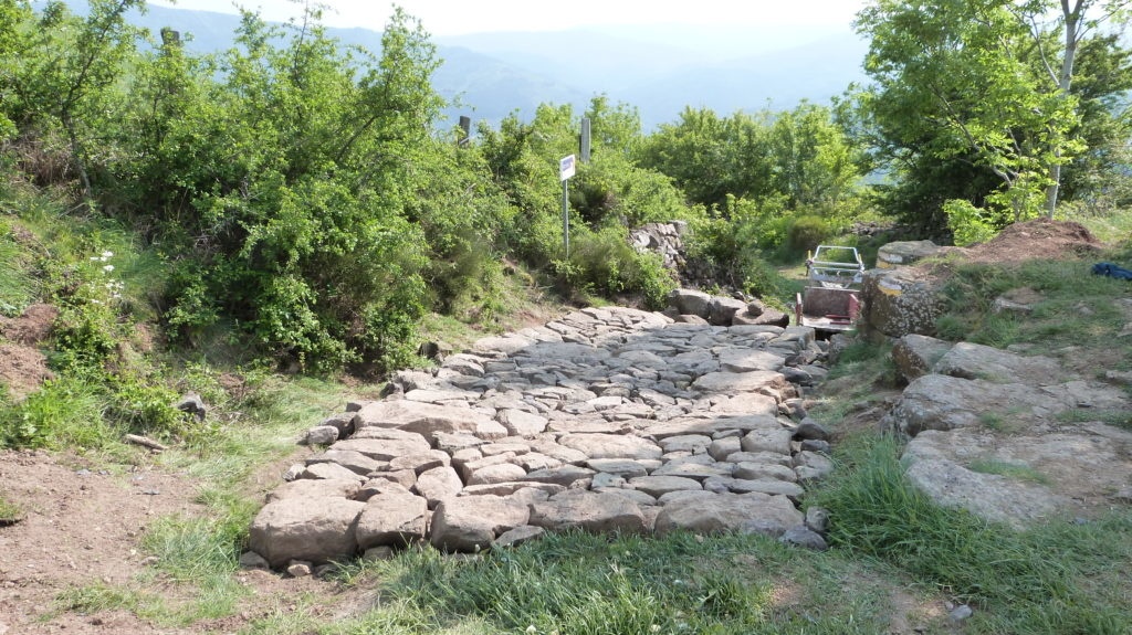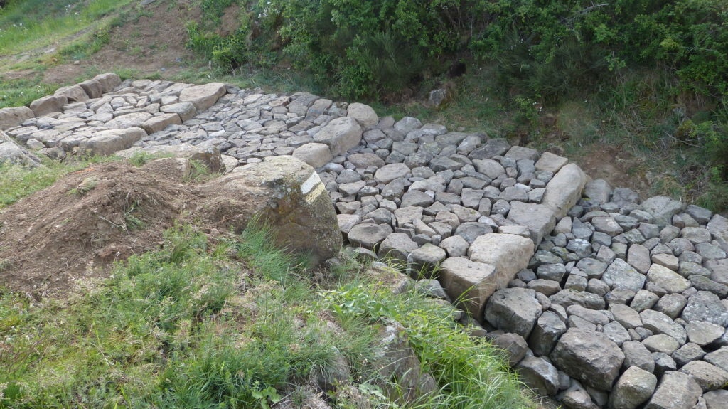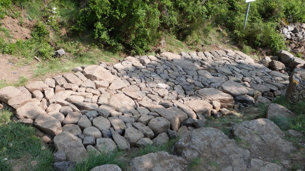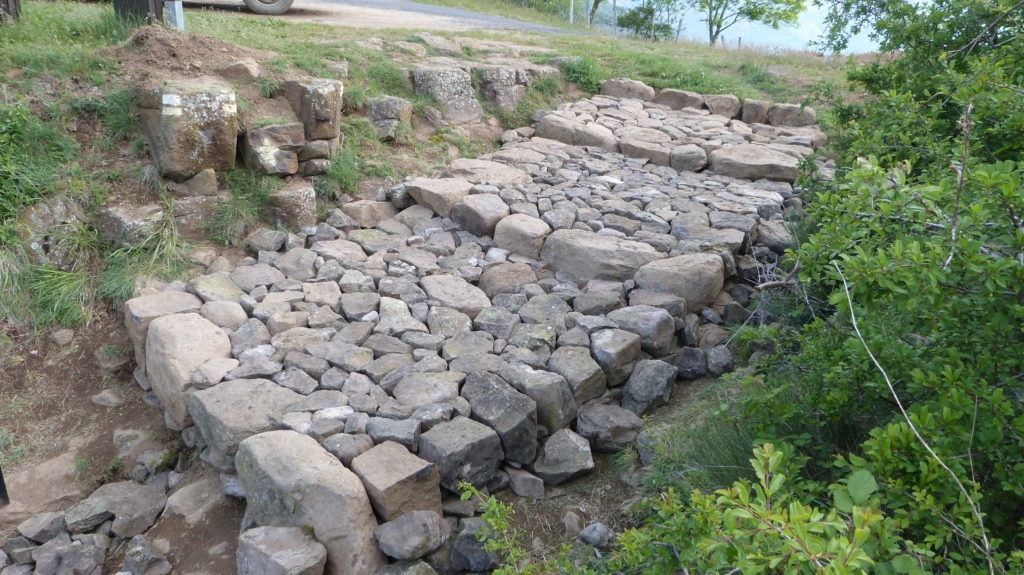 Nous avons réalisé cette calade avec l’association Elips (école locale et itinérante de la pierre sèche), sur le site du rocher du Brion. La calade a été réalisée à l’emplacement d’une ancienne calade, enfouie sous la terre. Les pierres récupérées sur place sont en roche basaltique, très dense et très lourdes.